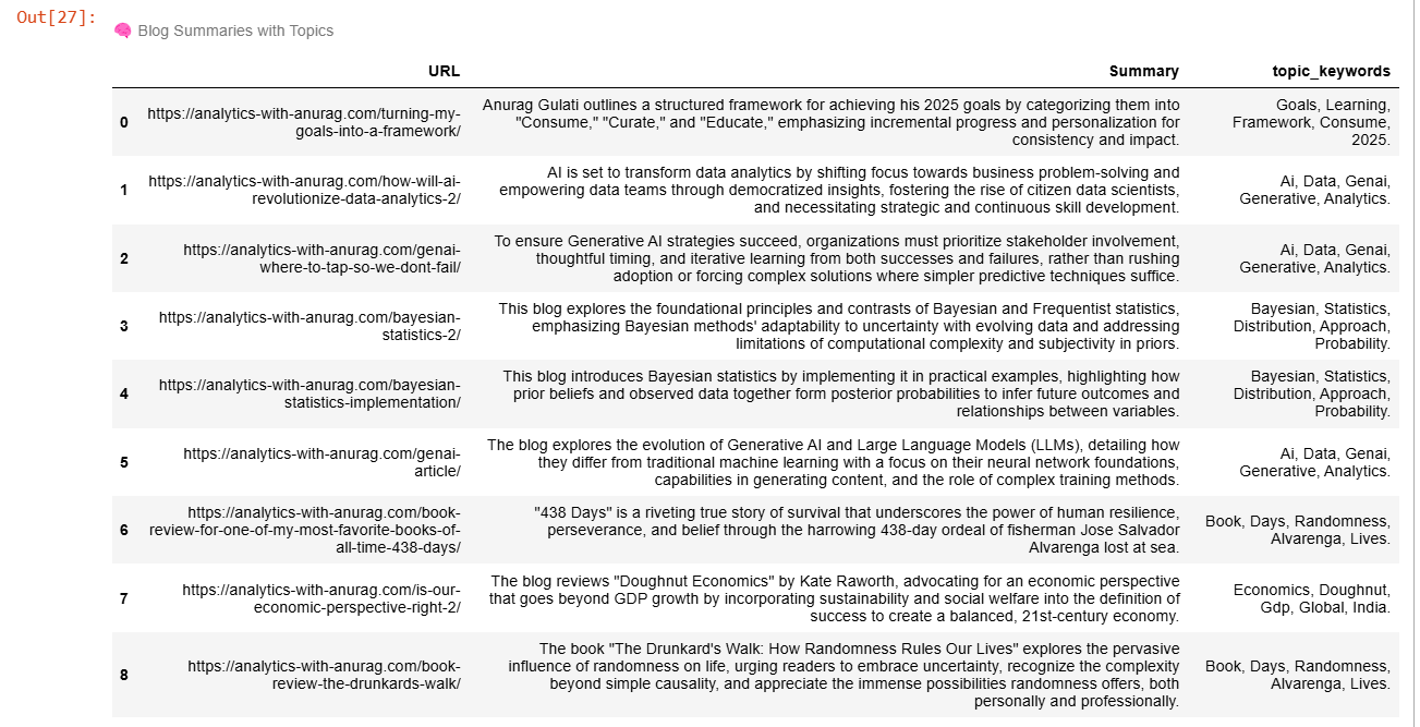 Here is my final summary: summary is the 1-liner summary of each of my blog. The topic-keywords are the result of topic modelling and tell us about the common themes that my blogs speak about. For example: the blog about my 2025 goals and learning frameworks - have modelled topics: